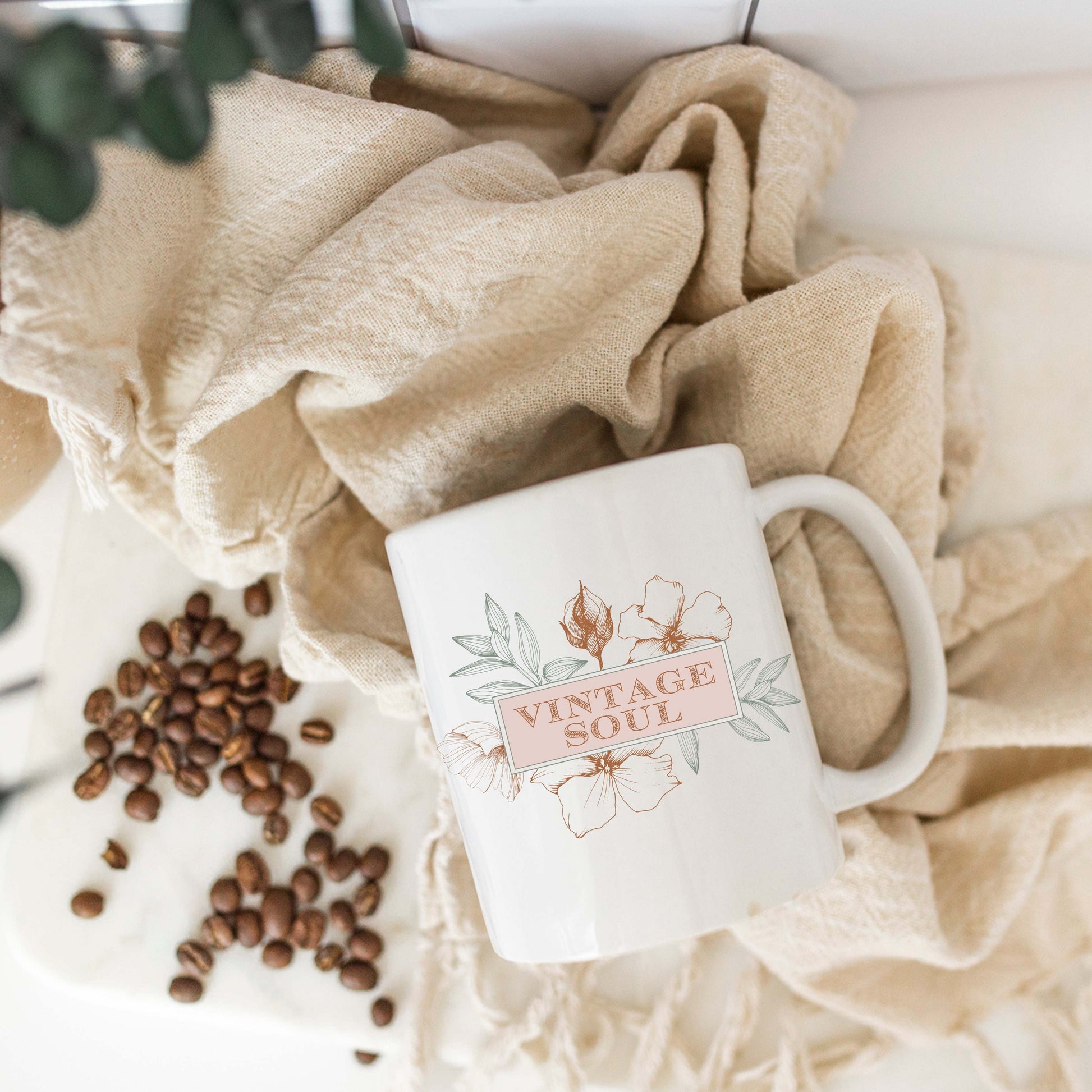 Vintage Soul Boho Floral ceramic coffee mug. It’s BPA and Lead-free, microwave & dishwasher-safe, and made of white, durable ceramic in 11-ounce size.